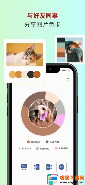 3. 支持导出到相应软件,点击图片选色,具备下载分享、在线搜索及配色卡编辑等功能。