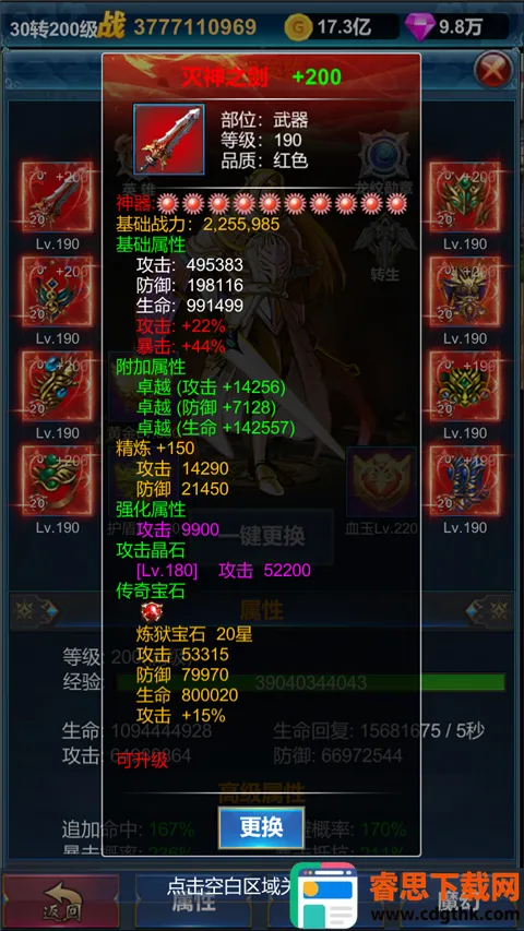 5、点击锻造,玩家们可对装备进行升级、强化、镶嵌宝石、晶石等操作;
