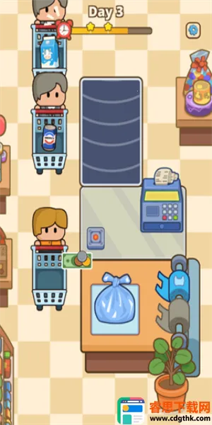 想体验当收银员的感觉吗?《收银员之星》就能满足你!这是一款超有趣的模拟经营游戏。在游戏里,你会化身超市收银员,面对形形色色的顾客。顾客来了,点击购物袋开始准备收银,再把传送下来的商品依次放到扫描器上扫描,然后正确放入购物袋整理好。随着关卡推进,还会解锁支付环节,要根据金额进行找零操作。