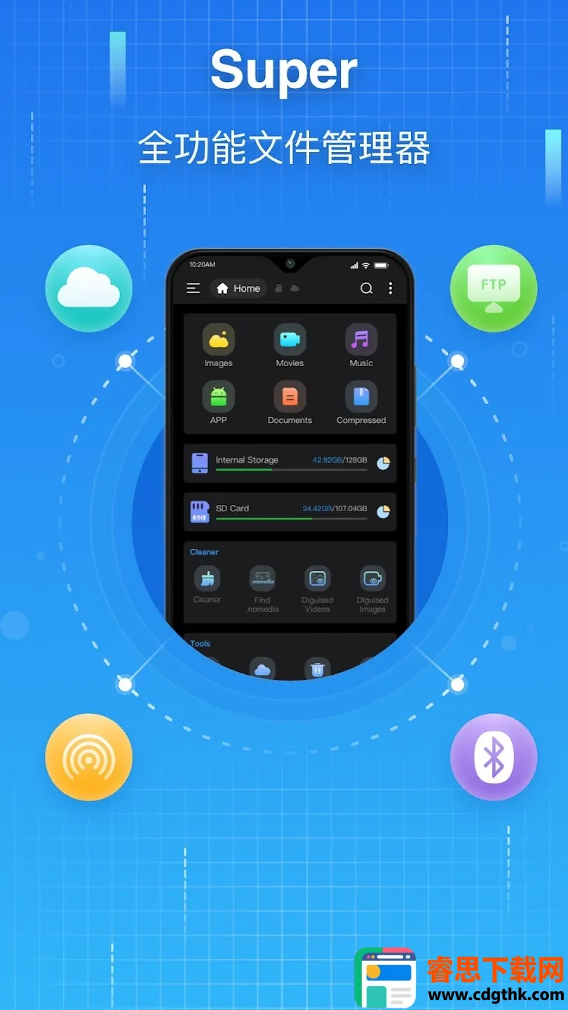 Super文件管理器最新手机版支持查看手机内各类文件,能清理大文件、重复文件,自动归类图片等。具备云盘直连、批量操作等功能,还有应用管理工具,操作方便,新手易上手,还解答了常见问题。
