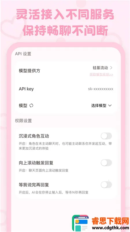 使用也很简单,下载安装后一键登录,进入我的页面点击API设按钮,设置相关参数就能和AI角色愉快聊天啦。它适用于情绪陪伴、早晚问候、目标打卡等多种场景,能当交友软件陪聊,也能作AI助手创作,快来下载体验吧!