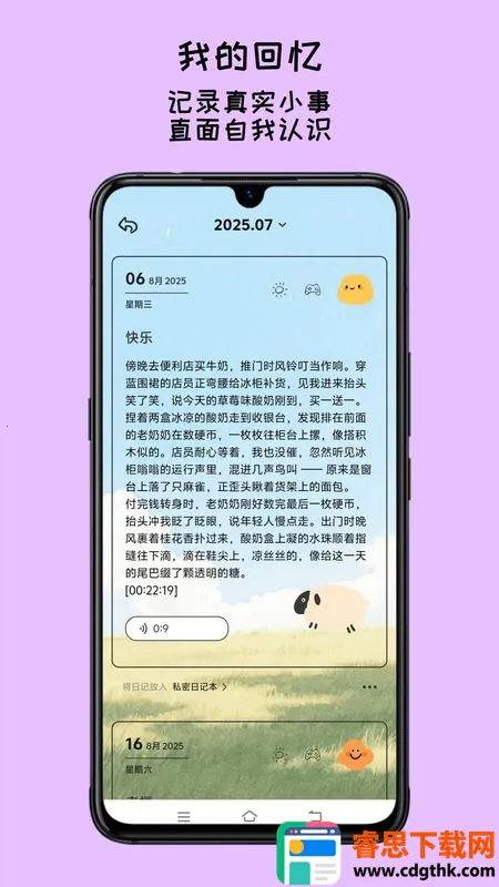这款手机记录软件超棒!它不局限记录形式,能保存所有想记的,还能分类设置。支持日记本共享,可和亲友恋人一起记录。采用独立私密方式保存内容,能共创多个记录本,记录时能插图片。亮点是细致记生活点滴且按时间保存,有多种记录模式,还能自动识别情绪并归纳。特色是保护隐私可设查看密码,图文并茂,量身打造个性化记录。无论是小事还是感悟,用它记录都很合适,能留存珍贵印记。