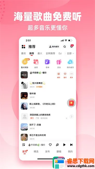 1. 海量曲库免费畅听:拥有海量正版音乐资源,涵盖经典老歌、DJ热歌、铃声、广场舞等全音乐种类,免费听个够。