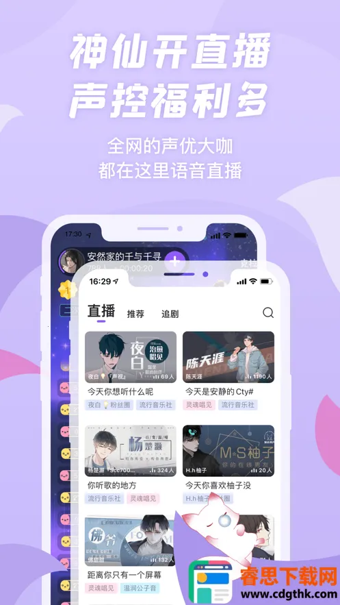 1. 海量声优在线:这里聚集了海量声优,是声音爱好者的交流基地,全网的声优大咖都在此语音直播,比如阿杰、夏磊、吴磊、柯暮卿等,能与他们连麦互动,还有暖心主播陪你聊天哄睡唱歌。