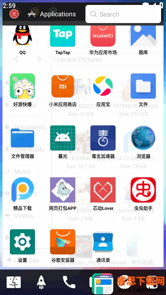 1、操作便捷:轻松在安卓手机上模拟出苹果电脑的界面,操作如同在mac电脑上一样方便,点左下角文件夹获取权限后就能管理手机文件内容,还支持快速分享处理图片,点击app可查看和搜索应用软件,在主页按住图标能随意拖动更改位置。