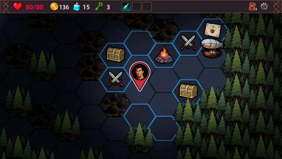 4. 六边形地图设计,探索灵活多变,高容错率鼓励冒险,浮空酒馆可互动,深入了解角色背景。