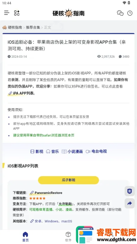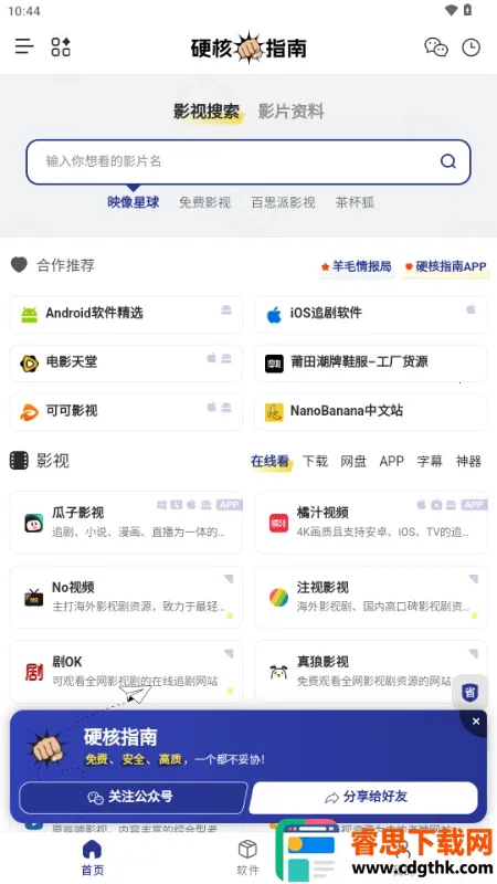 硬核指南是一款超棒的免费资源搜索平台!它能解决你找各类影视资源的烦恼。这里整理了超多优质影视资源站点,涵盖动漫、音乐、书籍、游戏等各种品类。界面简洁直观,无需复杂操作就能快速定位,大大提升观影效率。通过影视名称精准搜索,能快速跳转至对应站点观看或下载。它还汇聚海量影视相关软件栏目,可直接挑选下载各类影视工具。搜索影视也很简单,打开 APP 点击上方搜索框,输入影视名称就能触发检索,自动跳转至资源站点进行在线观看或下载。而且它建立了严格筛选机制,只保留画质清晰、更新稳定的正规资源站点,省去你自行搜索辨别试错的麻烦,避开低质违规与不良信息。下载软件也方便,安装 app 后,点击下方软件进入应用列表,找到目标影视栏目点击,按弹窗提示就能下载安装啦,真的超省心!
