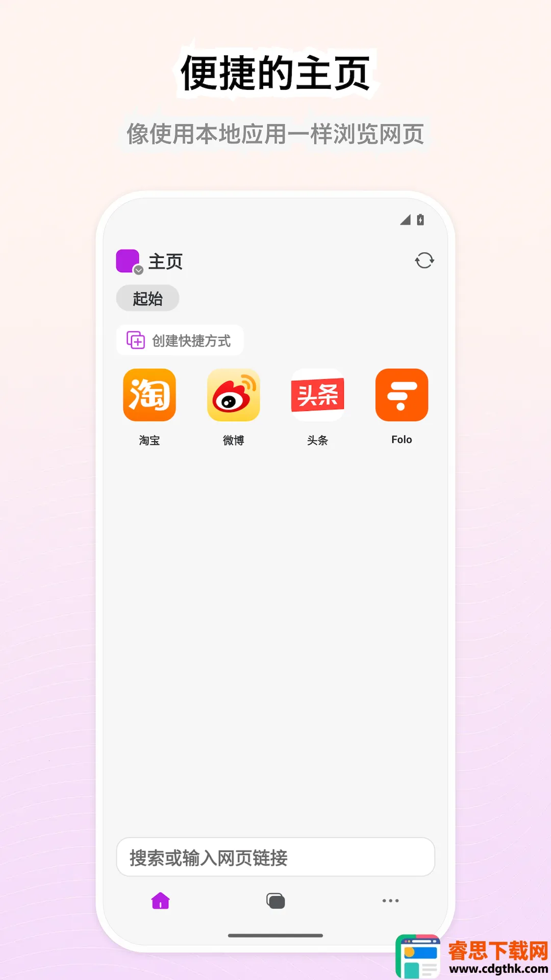 特色首页应用:简单添加网页链接可生成首页应用,单页面网页使用体验更佳,且无地址栏,能像原生应用一样使用。