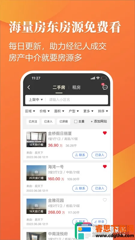 1. 海量房东房源免费看:全房源系统为全国房产经纪人提供大量房东委托房源,自动过滤重复、虚假房源信息,高效实时且免费查看,还能一键录入系统。