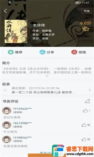 4. 连载书籍即时更新,书源优质,阅读体验流畅,还支持离线缓存。