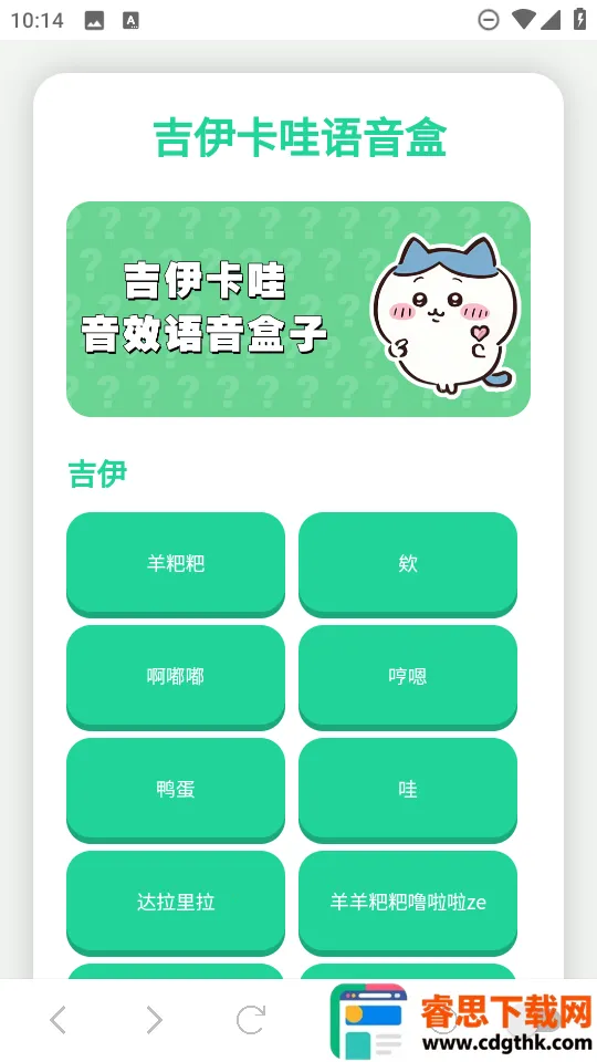 吉伊卡哇语音盒是安卓手机软件,为吉伊卡哇粉丝打造。收录超500条语音,含经典台词等。特色是分类细致、可收藏、支持离线。亮点有定时播放、音质清晰、可自定义顺序。不定期更新,免费畅享。