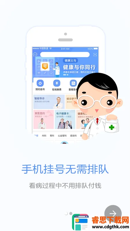 2、全面信息查询:能查看义乌市各家医院详细信息、自己的健康档案,包括门诊、住院、体检记录等,还可在线查询各类报告,如化验单、检查单等,以及住院信息和候诊队列信息,并接收智能提醒。