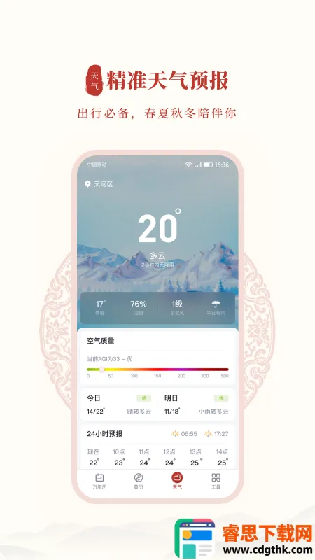 全方位精准天气数据,出行必备。能提前预知未来天气,提供实时温度、体感温度、24小时预报、7天预报、空气质量,还贴心提醒是否带伞,让出行无忧。
