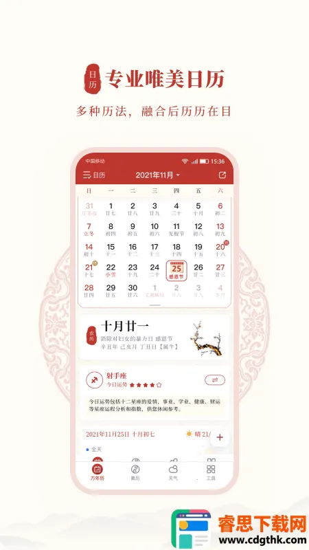 1. 融合新历、农历、黄历及天气查询,满足多样需求。