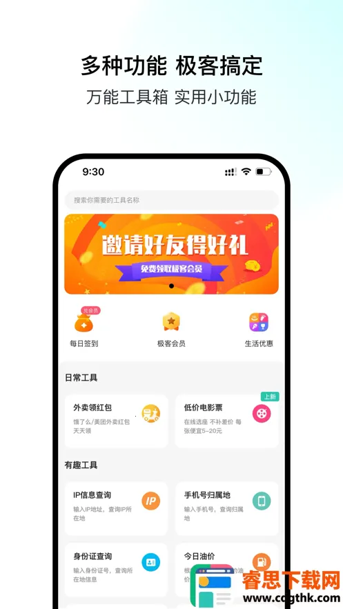 极客空间是一款超实用的手机工具箱软件。它功能强大,能满足多种需求。有视频去水印和图集去水印功能,能轻松去除视频和图片中的水印,让你分享无烦恼。还有电商优惠券,帮你网购省钱。低价电影票功能,让你以实惠价格看大片。领取外卖红包,点外卖更划算。历史价格查询,助你了解商品价格波动,买到性价比高的东西。它以极简风格原创设计,打造小众化聚合软件分享平台,分享众多网络工具及各类优惠券、网络资源。多种功能集于一身,堪称万能工具箱,实用小功能众多。其极简设计朴素清新,给人简约之美。还有专属客服随时回复,让你用得放心。如果你想轻松搞定各种需求,那就快来下载极客空间app吧。