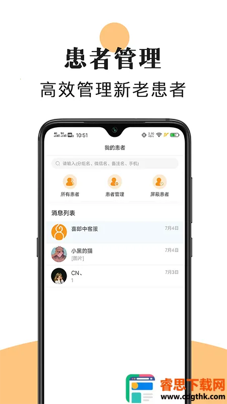 3. 便捷问诊:灵活应用远程问诊,提供图文、电话、信息咨询,辩证开方后快捷发送智能问诊单,可自定义内容适应不同科室需求,还能自定义患者管理,自由分组,一键群发,编辑档案清晰明了。