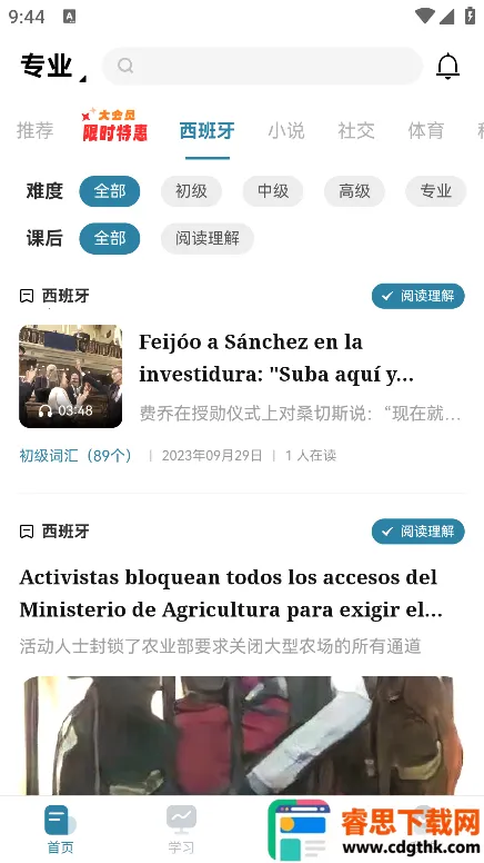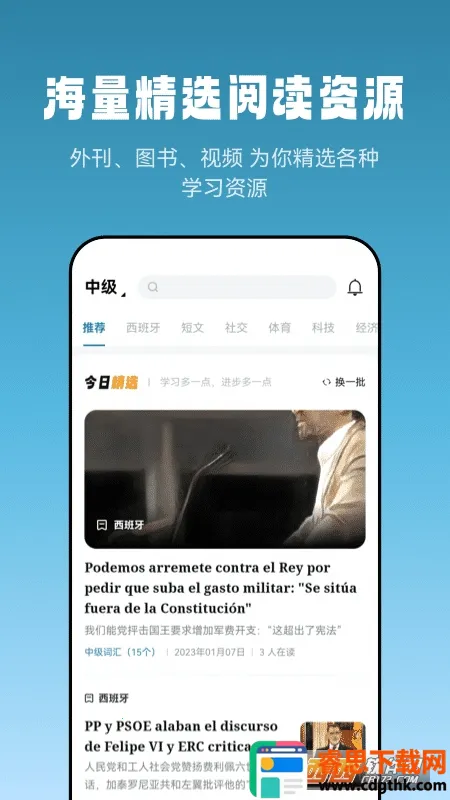 1、提供丰富多样的阅读和听力材料,涵盖新闻、小说等真实语料,涉及西班牙语国家多领域文化社会,助您了解当地文化。