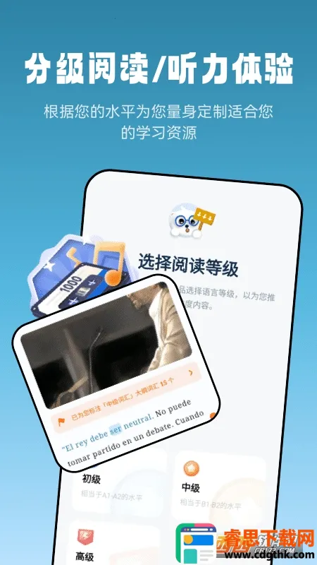 3、分级阅读与听力训练体系科学,参照欧洲语言共同参考框架划分等级,还有逐句播放、循环复读、调节语速及智能语音高亮跟随等贴心设计,强化听读联动。