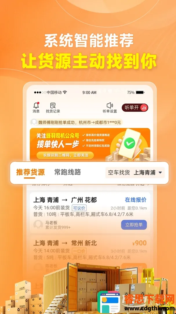 2. 海量货源实时更新:线上覆盖全国线路,涵盖多种运输类型,线下深度对接众多核心物流园区,不愁订单,旺季单量充足。