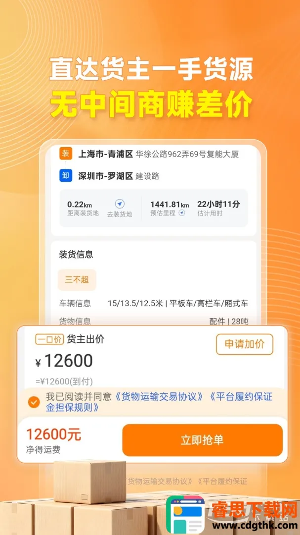 3. 透明结算保障:运费全额秒到账,平台0抽佣,双向信用评价体系担保交易,支持实名认证与放空赔付,资金安全有保障。