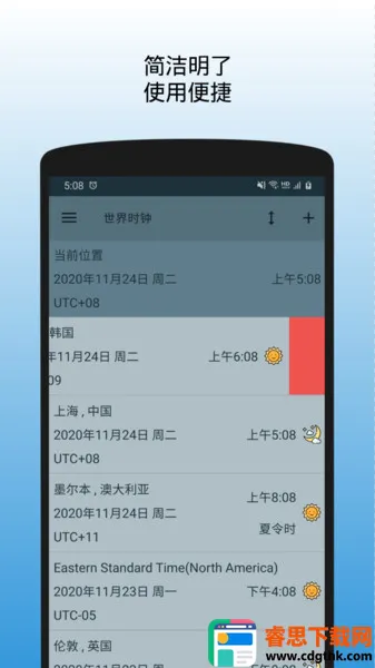 3. 提供日夜显示、夏令时标识等实用信息,可自定义界面主题与时间格式。