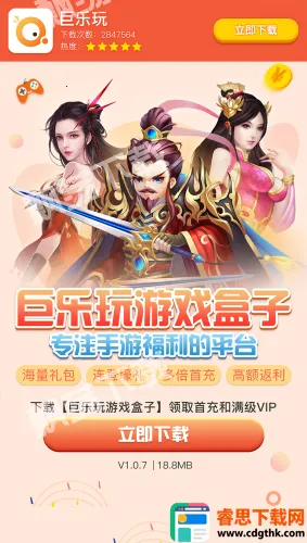 巨乐玩游戏盒子是一款超棒的游戏福利平台,能满足爱玩游戏的你各种需求。它汇集了超多好玩游戏,还有海量游戏礼包和最新最全的游戏资讯。使用起来很简单,打开盒子,就能轻松找到各类精品手游。这里公益游戏上线满V免费加速无限元宝还有GM特权;有独家福利,免费首充、海量礼包、大额代金券拿到手软;充值更有折扣,3折充值自动打折且官方授权永不封号。福利满满,上线送满V、无限元宝、绝版装备,充值返利日常高至500,节日活动更惊喜,充越多返越高。它还打造一站式多元化游戏服务平台,商城能买限量版装备。能线上领游戏任务边玩边赚钱,玩游戏还能获取丰厚红包。有了巨乐玩游戏盒子,让你游戏体验超爽,轻松享受游戏乐趣。
