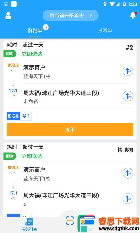 快跑者配送端2025官方正版是一款配送管理工具,类似滴滴抢单配送,全职兼职均可接单赚钱。功能有一键发单、定位调度、无缝对接多平台等,还能智能导航规划路线,助配送员高效完成任务。