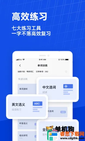 1. 提供多种训练模式,如单词自检、听音选义、中英文选词、拼写默写等,帮助考生全面提升词汇能力。