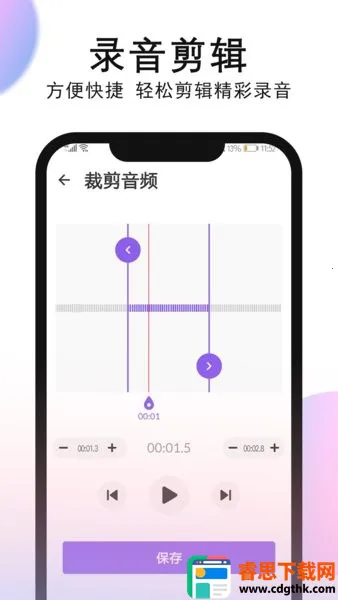 4. 具备实用的编辑功能,毫秒级剪辑工具可快捷剪辑,去掉无用音频,还能设置成铃声。支持音频管理,可分类查看录音、批量删除,支持音轨标记、编辑音频名称,方便分类查看。