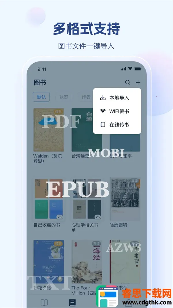 4. 多样导入更随心:多种本地图书导入方式,支持wifi传书、本地传书和在线传书,还能自定义图书分类排序和修改书名,打造专属书房。