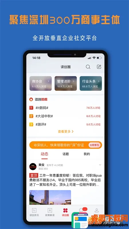 3. 功能丰富:涵盖财经资讯、政策解读、前沿科技动态等模块,还有商群、营商环境、商学院、读创直播等特色功能。