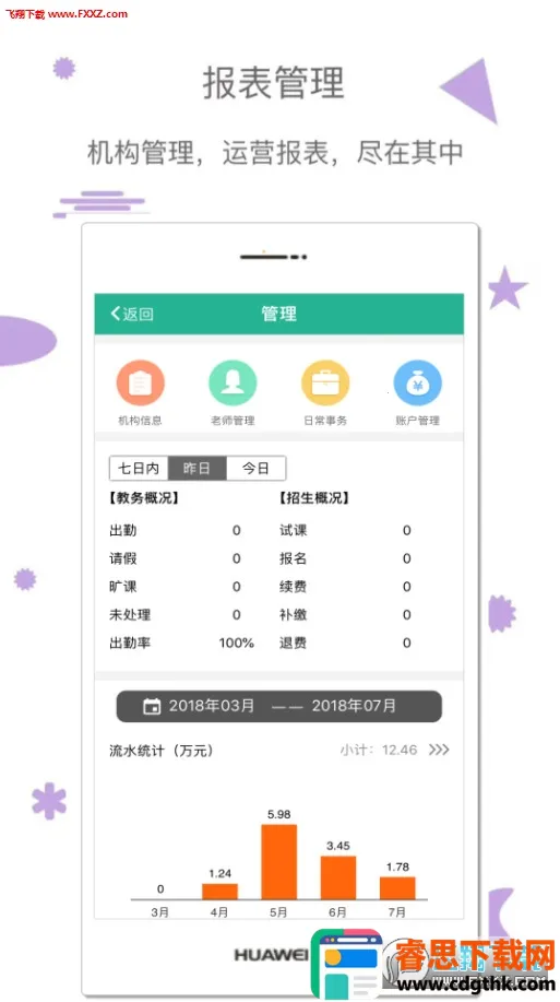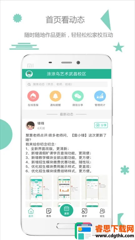 3. 免费且高效:是适用于单个校区学员达30人以上规模,美术舞蹈乐器跆拳道国学等各种素质兴趣培训机构核心管理环节的永久免费移动管理工具,利用互联网云平台技术,降低管理成本,建立品牌口碑。