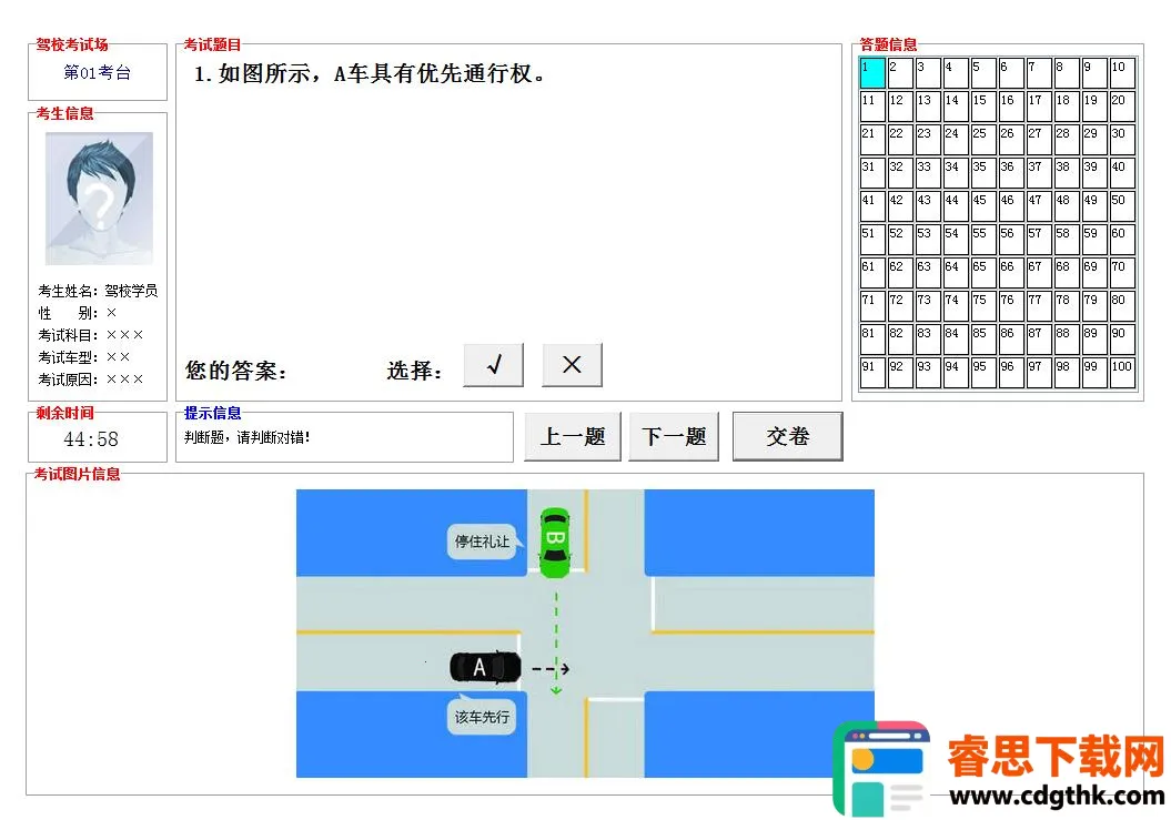 4. 提供真实考场模拟功能,模拟车管所考场真实界面,帮用户提前熟悉考试界面,平稳心态,事半功倍。