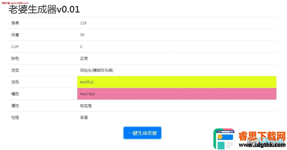 老婆生成器是一款超有趣的软件。它能随机生成各种人设,包括身高、体重、肤色、发型、发色、瞳色、属性、性格等。操作特别简单,轻轻点击就行。对于喜欢画漫画或写小说的人来说,灵感枯竭时用它生成个人设,能给自己动力继续创作。软件里有多达上百款妹子模型可自由选择制作,还有日系二次元画风,高度自由的捏脸系统能打造个性角色,丰富的精美服装可搭配。每次点击生成的属性都不一样,能满足不同喜好。这里没有繁琐操作,动感迷人造型带来细致逼真感受。宅男们也能在这里找到各种可爱类型角色。想知道生成的老婆啥样?进入游戏入口,按给定选项选好喜欢的类型,等一会儿就能看到啦,简单又好玩,快来试试吧!