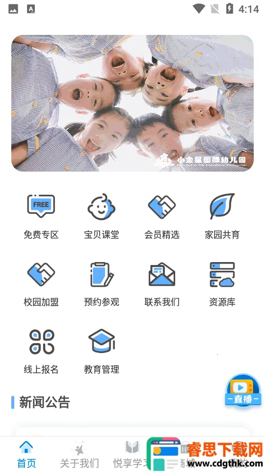 它是专业的学前教育软件,提供多种教育服务,有线上视频课程助力教育管理,还能获取实时更新的幼教新闻资讯及丰富课程资源,实现便捷家园互动。