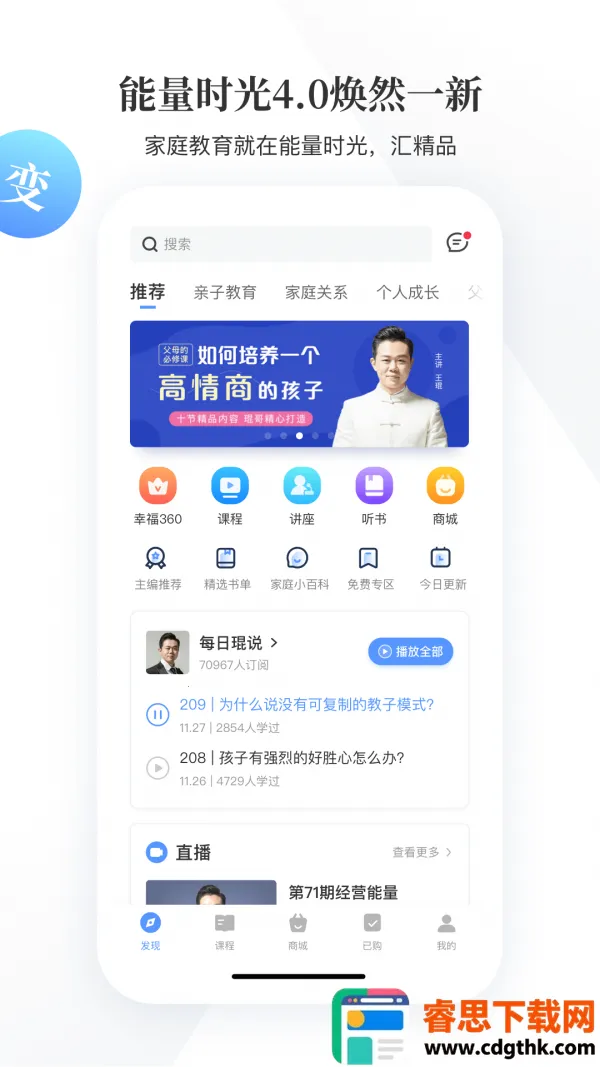 能量时光app是中国家庭教育内容运营商,有丰富课程与书籍。能帮用户解决家庭问题,利用碎片化时间学系统化家庭教育知识。教育大咖坐镇专栏,还有365学习计划,助用户开启高效学习之旅。