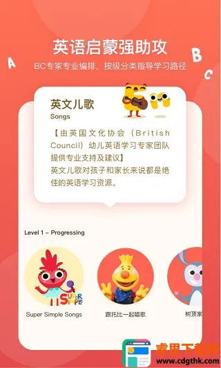 2. 由英国文化教育协会专家团队编排,按级分类指导学习路径,通过英文儿歌、动画故事等方面给孩子更好引导。