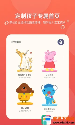 3. 贴心家长定制功能:家长可添加孩子喜欢的动画,定制启蒙动画语言。手机锁屏能进入宝宝安全模式,还可根据孩子特点合理限定每日观看动画时长及禁播时段,超时自动切换音频收听模式,家长端小程序能让家长随时随地了解孩子当天的动画观看时长,真正做到让家长放心。