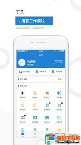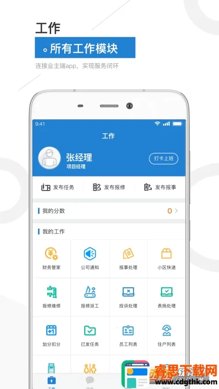 暖心服务:有着实用的上下班打卡功能;通过列表形式管理员工名单并记录联系方式;支持在线记录小区快递信息,从多方面提供暖心物业服务,提升服务质量。
