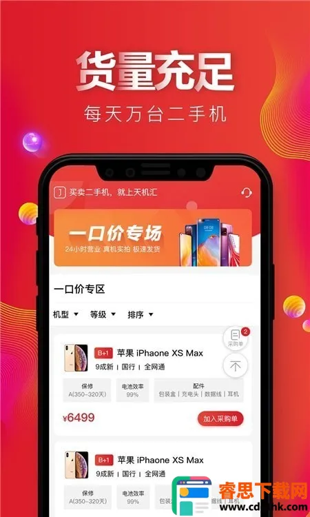 1. 货源充足:每天有大量二手货源同场交易,各种品牌、型号的手机应有尽有,查找商品方便,随时能预览信息并加购下单。
