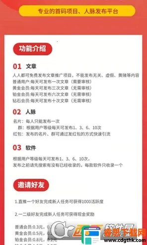 2. 会员体系丰富:采用阶梯式成长设计,不同等级对应差异化发布权限、推广折扣、分佣比例与资源支持。普通会员注册即享每天可发布文章、微信群、软件资源各1次(需平台审核),邀请好友可享一级二级共102的消费提成;黄金会员、铂金会员、钻石会员权益逐级提升,满足从入门到深耕的全周期需求。