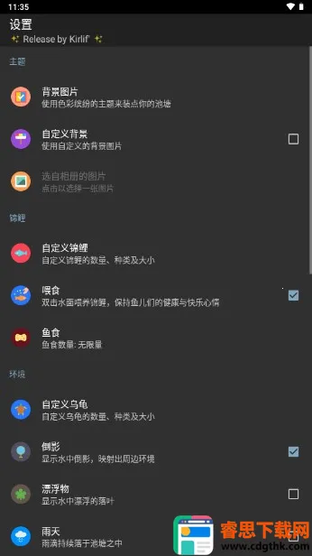 3. 场景与参数可定制:提供多组绮丽自然场景,还有许多参数可供选择,像鱼的速度、生长速度等,能打造个性化池塘。