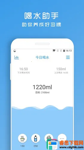喝水助手app由深圳市趣创云科技有限公司研发,能智能提醒喝水时间,依性别体重估算每日饮水量并按时间分配,自动生成计划目标,还有喝水记录、知识及云同步等功能,助你养成健康饮水习惯。