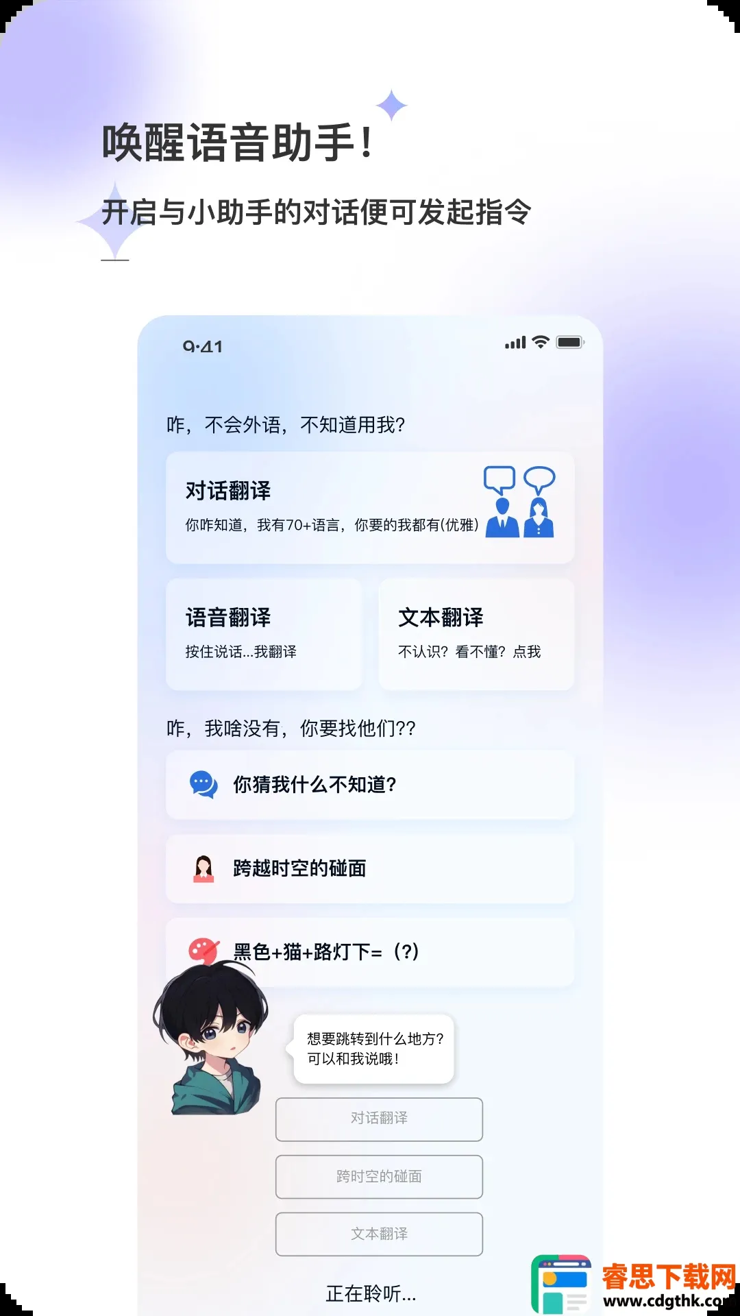 4. 操作便捷,进入软件后可按需选择功能。对话翻译、AI对话等操作简单,能快速实现翻译、问答,还可按需求创作获取专属绘画。