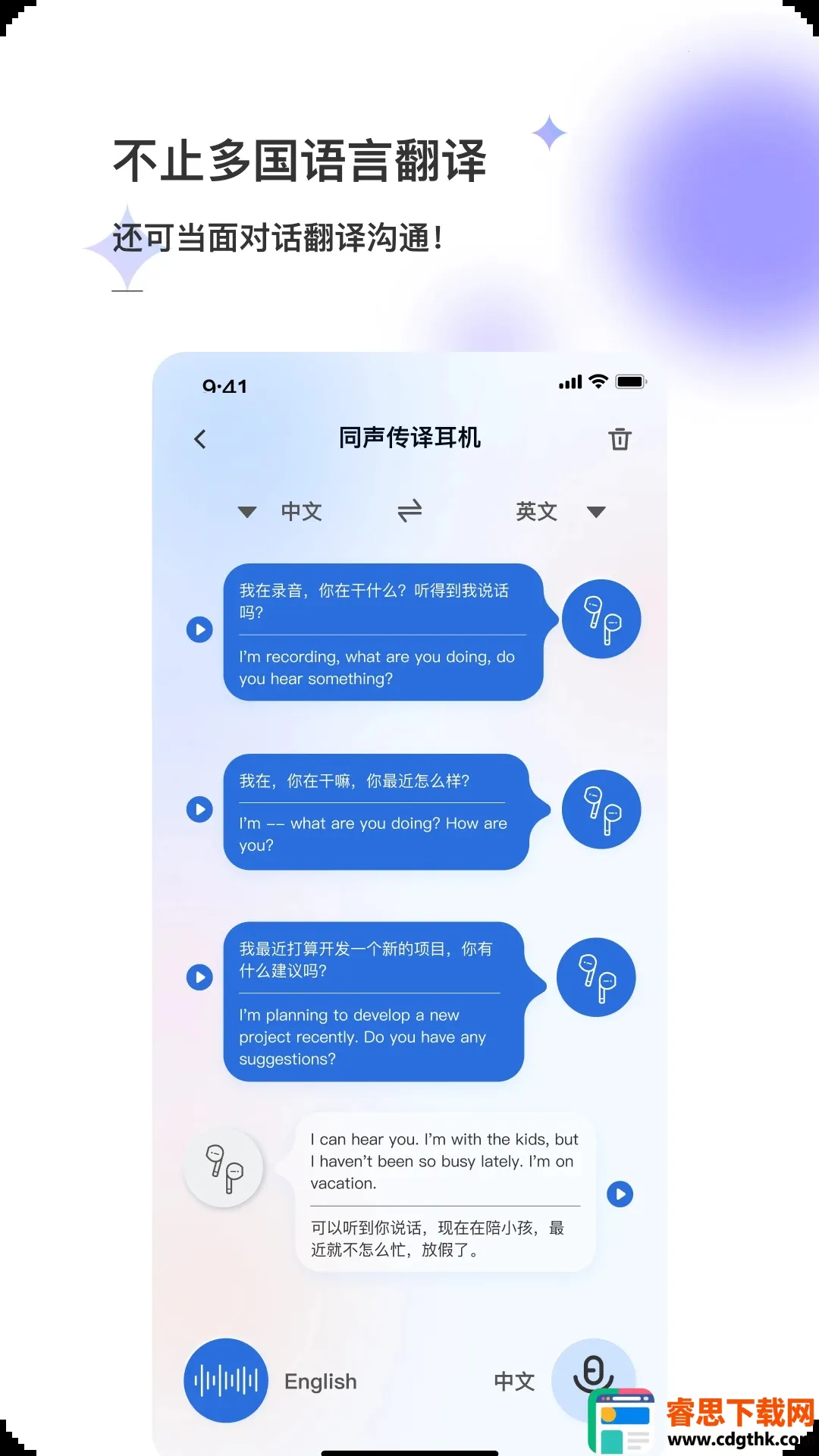 1. 智能AI与翻译完美结合,提供方便快捷的语言翻译服务,涵盖对话翻译、文本翻译、语音翻译、同声传译等多种方式,满足不同场景需求,助你与外国人更好交流,轻松展开同传办公。