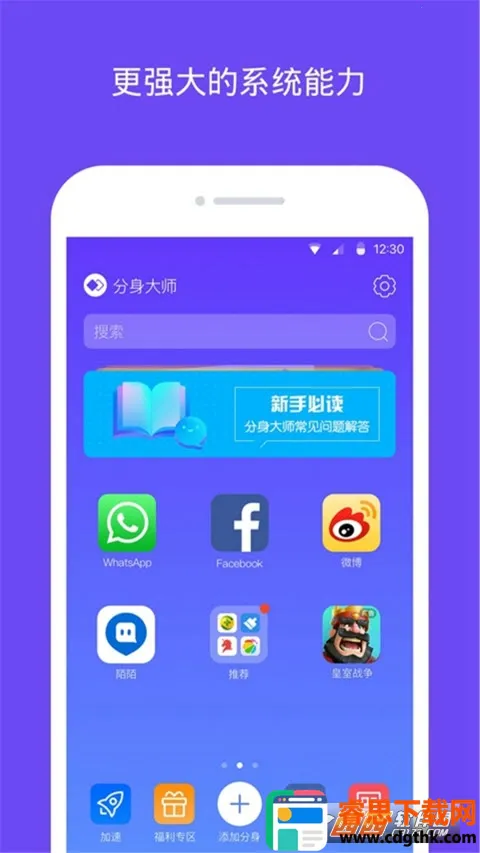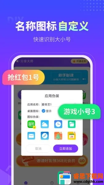 3. 使用便捷:超小体积包,支持快捷图标、自定义名称,多开个数无上限;操作简便,点击主页添加分身即可多开,还能一键清理后台加速手机运行,无需账号切换就能向不同朋友圈发布或浏览信息。