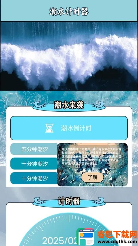 1. 精准计时:拥有经典趣味的潮水计时器,能便捷使用,快速精准地计时,让你轻松掌握不同时间段的潮汐变化,准确知晓潮水来袭时刻。