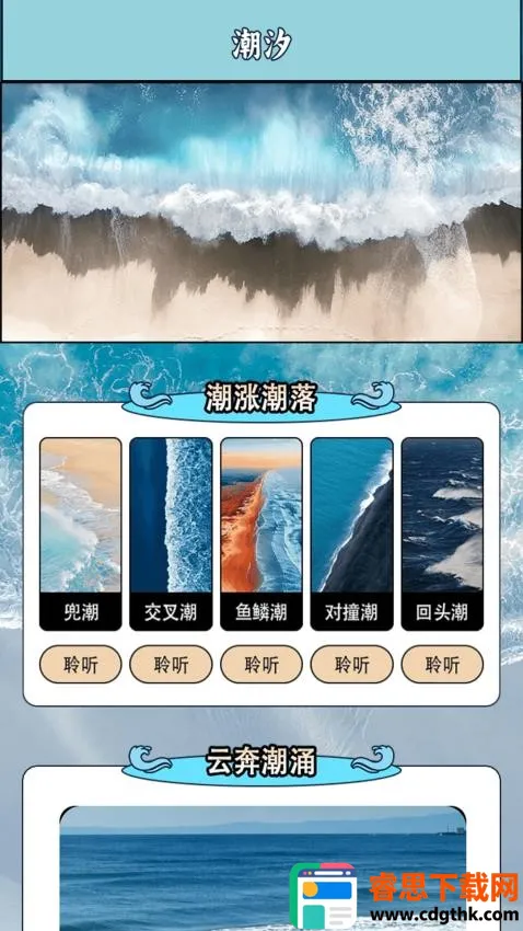 3. 多样体验:为用户提供多种精彩内容,不仅有多种潮汐涨落的声音可一键聆听,享受沉浸式体验,还能查看多种多样的潮汐画面,感受不同的潮汐场景。