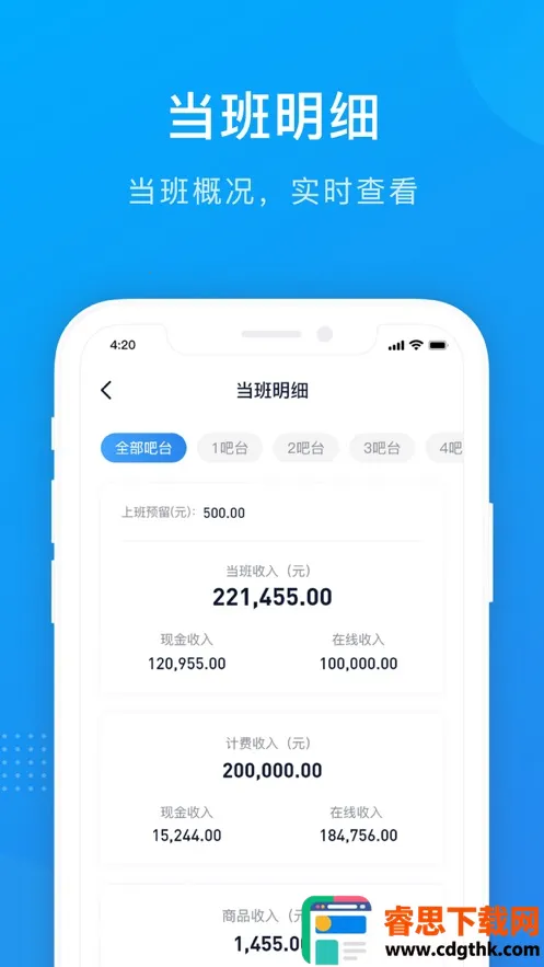 2、收入情况清晰呈现,营业收入、当班明细等概况实时查看,让您对网吧经营状况心中有数。
