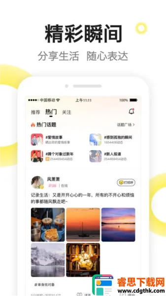 动态广场,分享生活:可发布个性化动态,展示真实自我,分享生活点滴与感悟。